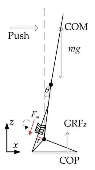 Upright standing push-recovery is depicted in a general way in Figure 1. The single IP model is usually adopted to describe the body dynamics. However, a multi-joint IP model is more applicable, as human joints are flexible when in a natural upright standing posture [,]. Thus, the body is not specifically assumed to be a single IP in this paper. Here, it is important to note that no matter which model is adopted, ankle joint torque is provided by the calf muscle. When subjected to external disturbance, the human body leans forward and loses its balance. In such cases, sensed by muscle sensory organs, the calf muscles are stretched and evoke a reflex response, so that resistant tendon force (Fm) can be produced to resist the external disturbance and balance the human body. As the reflex loop is short and fast, ankle joint torque is promptly provided to maintain the body’s upright balance.