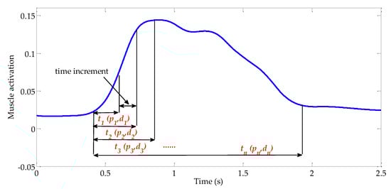 Data (a, θ and ) recorded from experiments are used to calculate pa and da. As high-level command may be involved in the control process, it is uncertain what length of time interval is most appropriate to be used. A time-increasing searching method, as illustrated in Figure 3, is proposed to find a proper time interval. The start-point of the time interval is at the time point where angular velocity begins to increase. The threshold of angular velocity is empirically set to be 0.01 rad/s. The end-point moves from the start-point to the end-point, at which muscle activation returns to the normal level with a time increment of 10 ms.