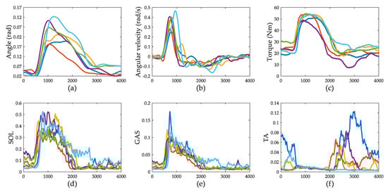 Experimental results for subject A. Each color represents one trial. There are six trials. The x-axis is the time in ms. (a) shows the measurement of ankle joint angle. (b) represents the ankle joint angular velocity. (c) shows the ankle joint torque. (d) shows the muscle activation level of SOL. (e) shows the muscle activation level of GAS. (f) shows the muscle activation level of TA.