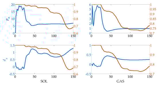 The corresponding pa and da values of Figure 10 are listed in Table 1. The relative standard deviation (SD/Mean) of pa (SOL: 0.09, GAS: 0.19) is smaller than that of da (SOL: 0.69, GAS: 0.82). Compared with da, the values of pa do not change much. It seems that the da value is more sensitive to the disturbance.