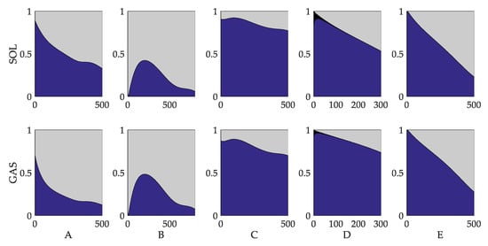 The contribution of the damper component, namely, the component evoked by velocity, is significant. The ratio between fiber length and velocity contributions is depicted in Figure 14. The velocity component accounts for more than 60% in the first 300 to 500 ms in subjects C, D and E. For the other two subjects, the velocity parts account for 20 to 80% in the first 500 ms. According to [], angular velocity is assumed to be a factor that effects reflex gains under the circumstances of upright standing ankle strategy. In the early phase of push-recovery, the velocity part leads to increasingly rapid muscle activation and assists in inhibiting the trend of leaning forward. According to the results obtained in this study, the damper component is of great significance in the forepart of push-recovery.