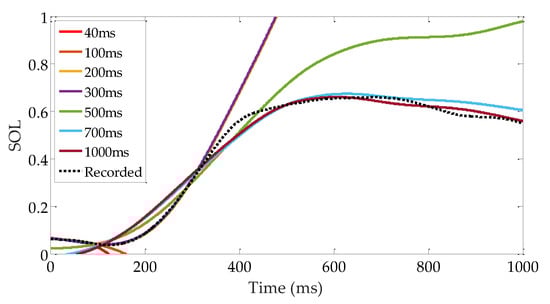 Muscle activation prediction results using different reflex gains. The gains are calculated from different lengths of data. The dotted line is the measured muscle activation. The results show that the prediction results are not acceptable if the length of the data is too short.