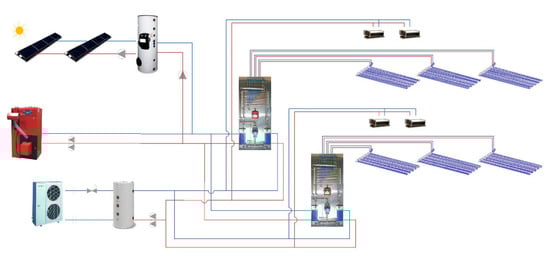Possible schematic diagrams of these capillary mat systems have been widely addressed in recent publications [] (Figure 1). When working with water at moderate temperatures in both summer and winter, it is feasible to use alternative energies: solar panels, lithium chloride-based chemical energy accumulation systems [,], absorption systems, geothermal energy systems [] or use of seawater [], among others [].