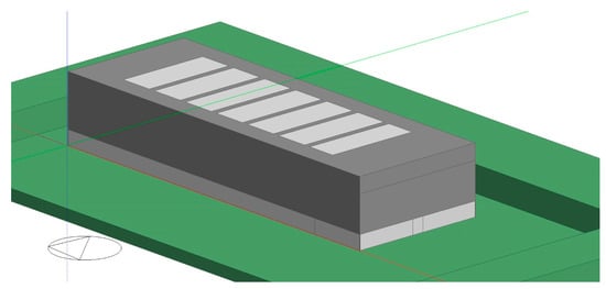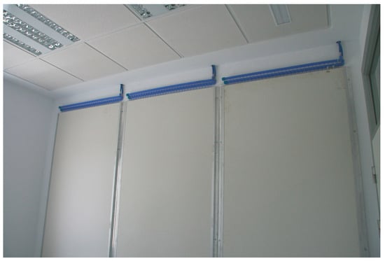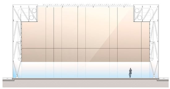 The Museum of the University of Alicante (MUA) is composed of a range of different volumes. Some rooms are semi-buried, and the rooftop is covered by a bed of water. The main room or “cube”, which is where we will apply the TCP panels, is an extensive, flexible space lined on the inside with bakelised wood boards, measuring 63 × 22.5 × 9 m (Figure 3). The configuration is based on passageways throughout its perimeter allowing circulation over three levels for maintenance tasks. The circulation under the roof also takes place through 8 passageways. This buffer space is used for all the building’s lighting, air-conditioning and water-evacuation installations (Figure 4). The roof includes 7 giant skylights with orientable aluminium external blades. The perimeter on the ground floor is made of simple glass, with MD panel-based protection.