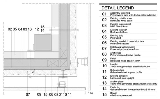 The interior enclosure consists of white lacquered MD panels glued with polyurethane cord on timber frames, screwed on a steel tube substructure. The outer enclosure was made up of sandwich type panels with rock-wool insulation, phenolic outer panel, MD interior panel and timber frames on the periphery. The enclosure was damaged because of humidity, solar radiation and thermal differences caused by thermal bridges due to the insulation material’s discontinuity []. In 2010, the enclosure underwent an energetic rehabilitation. A total of 3 cm of projected polyurethane was applied to the existing skin, and a ventilated facade was generated, taking advantage of the existing metal substructure, with latest generation phenolic panels (Figure 5).