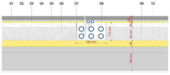 Ceramic thermal conditioning panel applied to the MUA floor. 01: Large-format porcelain stoneware piece. 300 × 100 × 2 cm. 02: Adhesive layer. Beka Thermal Conductive Paste V. WLP. 1. Thickness: 6 mm. 03: PPR capillary mat. Diameter: 3 mm. Separation: 10 mm. 04: Polyurethane foam thermal insulator. Thickness: 10 mm. 05: Regulatory layer. Self-levelling cement mortar. Average thickness: 10 mm. 06: Coating of screed: expanded clay. Thickness: 80 mm. 07: Aluminium channels to pass the PPR distribution pipes through. 08: PPR distribution pipes. Diameter: 32 mm. 09: Thermal insulator. Type IV expanded polystyrene. Thickness: 40 mm. 10: Reinforced concrete slab with electrowelded mesh 150 × 150 mm. Thickness: 150 mm.