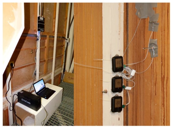 As indicated above, the MUA was monitored during the complete cycle of the year 2014, with more than 30 sensors of surface temperature, indoor and outdoor air temperature, relative humidity, pyranometer, indoor air velocity, etc. The monitoring system was designed to be wireless. The surface temperature sensors are connected to small analysers, model “EL-WiFi-TC-Thermocouple Probe Data logger”. Other types of “EL-Wifi-TH Temperature and Humidity Data Logger” analysers, with built-in indoor air temperature and relative humidity sensors, interpret the recorded data [] and send wifi signals to a “RouterOS” model router. That router is connected to a laptop computer (Figure 7). By installing the “EasyLog Wifisoftware”, the data sent by the analysers is received and stored on the computer. The data is sent daily to a virtual disk and using a personal code, the information can be accessed from any network point. In addition, a small station was installed on the roof of the building with sensors of outside air temperature, relative humidity and a pyranometer (Kipp Model CMP3 Pyranometer Iso Second Class) to measure solar radiation.