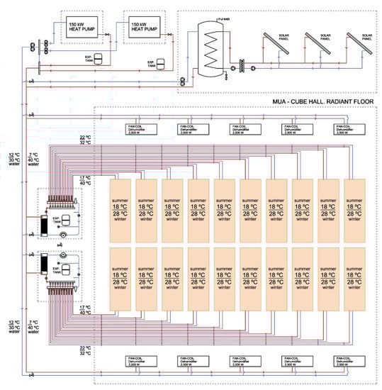 OP2. Installation of PPR capillary tube mats, in TCP panels, with an air-water heat pump model Aquasnap 30RQSY039-160 by Carrier, 148 kW cooling power and 162 kW heat power similar to OP1, distribution of water to two distribution substations located in the MUA’s conduits, and water distribution in the secondary circuit by a total of 24 independent PPR 32 mm in diameter circuits per floor, and ten fan-coils strategically located for air dehumidification, each with a cooling power of 2.5 kW.