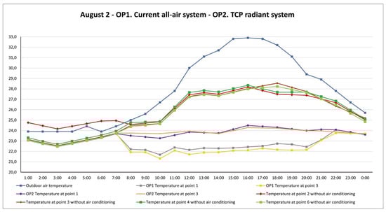 Temperature of indoor and outdoor air in summer, with an all-air system, underfloor TCP ceramic panels, and no air conditioning. OP1: Option 1; OP2: Option 2.