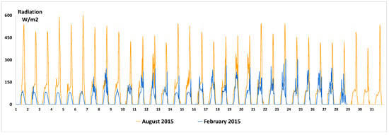 The energy savings gained by incorporating a system of thermal solar panels on the rooftop into the installation of air conditioning based on radiant floor TCP panels (OP3) will be analysed []. These solar thermal panels operate by heating the system’s water in winter or cooling it in summer by means of an absorption cooling system [,], or chemical energy (solar cold) [,]. The solar radiation power data on the MUA’s rooftop were collected during the complete year 2015 cycle, by means of the pyranometer installed on the wireless monitoring system described above. Scheme 2 shows the radiation values obtained for the months of August and February. Table 4 shows the daily average values of energy collected each month, as well as total days of sunshine. These values were compared with other sources and recent publications that collected these values for the Spanish Levante; correlated values were obtained [,].