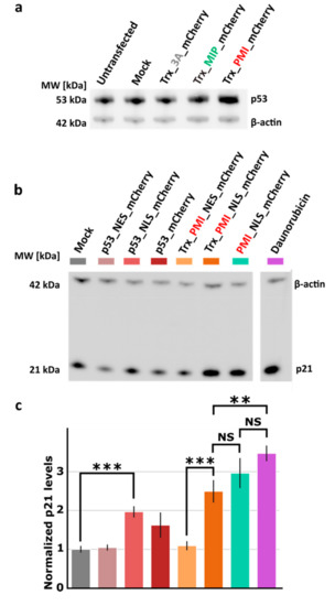 Next, we asked whether PMI had to localize to either the nucleus or the cytosol to exert its function. For this purpose, we added a nuclear localization signal (NLS) or a nuclear export signal (NES) to the Trx-PMI-mCherry construct. This time, we decided to look directly at the effect of the peptide on one of p53 target genes, p21. Indeed, it is important to make sure that stabilized p53 is fully functional. As additional controls beyond the mock transfected cells, we included cytoplasmic p53 (p53-NES-mCherry), nuclear p53 (p53-NLS-mCherry and p53-mCherry, which is largely nuclear even in the absence of an additional NLS) and daunorubicin, a double-strand DNA breaks-inducing drug. Interestingly, we found that the peptide had to be nuclear to elevate p21 levels (Figure 1b,c).