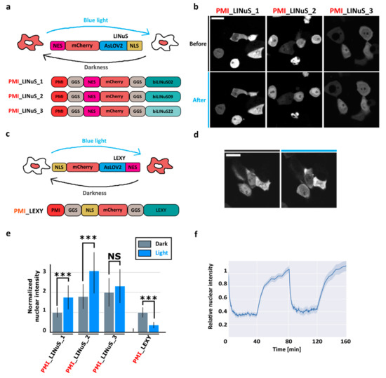 As the function of PMI is dependent on its nuclear localization, we reasoned that, if we could control this latter with LINuS, we could effectively control endogenous p53 levels with blue light. To this aim, we cloned three constructs differing only in the LINuS variant used, as different NLSs photocaged in the Jα helix of the AsLOV2 domain have different properties such as background in the dark or extent of nuclear accumulation after light induction [33] (Figure 2a). Albeit two of the three constructs showed statistically significant nuclear accumulation after light induction (Figure 2b,e), we were not satisfied with their performance, as the fold change in nuclear localization before and after light was less than two.