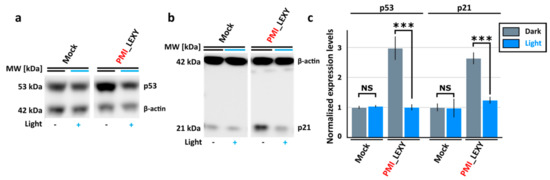 Next, we asked whether we could dictate p53 levels by externally applying blue light to the cells expressing PMI_LEXY. We found that cells kept in the dark had ~3-fold higher p53 levels than mock transfected or illuminated cells (Figure 3a,c). Finally, we assessed whether we could also detect higher p21 levels in HCT116 cells kept in the dark. This was indeed the case (Figure 3b,c).