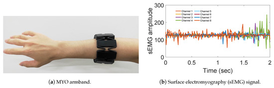 - Physiological interface module. Physiological interface module consists of sEMG signal processing unit and sEMG-signals-stiffness translation unit. In this module, raw sEMG signal is collected by the MYO armband. The human stiffness can be obtained through the sEMG-signals-stiffness unit.