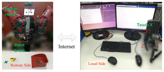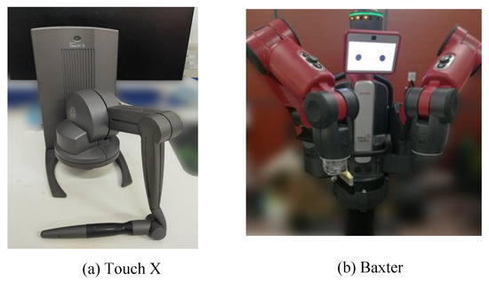 - Hardware equipment. The experiment hardware equipment consist of the Touch X, the Baxter robot, and the MYO armband with eight channels. The left panel of Figure 5, exhibits that a red garbage bucket and a yellow tapeline (as garbage) are placed on the testbed. A paint brush is installed in the right arm of the Baxter robot.