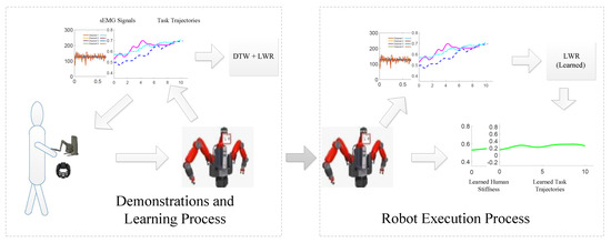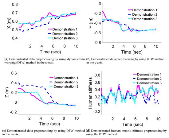 - Demonstrations and robot learning module. This module is the main part of the proposed frame. The data processing unit is used to process task trajectories from the remote Baxter robot. The collected data contains task trajectories and human stiffness. The collected task trajectories and collected stiffness are ready for the demonstration and learning process. DTW unit is used to align the demonstration data in a united time scale. The robot learning model is mainly used to obtain a generative model according to the demonstrated information related to the collected task trajectories and collected muscle stiffness.