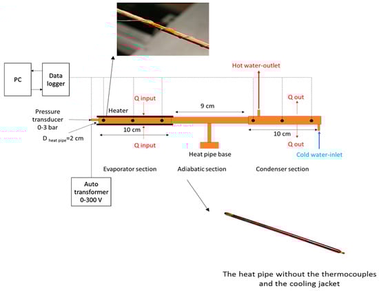 With the continuous advancement and development in the structure of the cities, demand for new technologies and, as a result, energy has increased []. With limitation in fossil fuel and environmental pollution due to the combustion of carbonaceous fuels, special attention has been paid to renewable energies as a reliable source of energy [,]. Solar energy is one of the potential renewable energy resources, which is available to a vast region of the world. However, the intermittent behavior of solar energy during the on-sun and off-sun periods dictates that the solar receivers and collectors must have plausible thermal efficiency to maximize the energy absorption from the sun [,,]. A solar thermal collector is a two-phase apparatus embedded with heat pipes (HPs) to absorb the solar thermal energy and transport it to the top header using the HPs []. A HP is a heat-exchanging medium, which employs a working fluid with plausible thermal properties with low boiling point which can easily be evaporated inside the HP [,,,]. A HP composed of an “evaporator section”, in which the working fluid is evaporated using boiling mechanism and flows through an “adiabatic section” to reach a “condenser section”. In the condenser section, the vapor phase loses its thermal energy and is condensed to the liquid phase. The formed liquid returns to the evaporator using a gravity-assisted falling film. The heat transfer in HPs does not need any external energy, thereby nominating HPs as one of the efficient technologies for heat transfer within a confined space. The current HPs employ alcohols and acetone as the working fluid; however, these working fluids have poor thermal conductivity, which strongly affects the thermal performance of the HPs. Since Aragon National Laboratory introduced the “nanofluids”, a new direction of research was developed in thermal engineering science and in different research areas including single and two-phase heat transfer [,,,,,,,,]. A nanofluid is a suspension of some conductive powders such as metal oxides uniformly dispersed within a common cooling fluid such as water or oil [,,]. Hence, dispersion of nanoparticles requires specific techniques such as using ultrasonic waves and controlling the pH value of the nanofluid [].