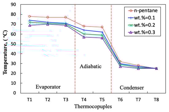 Figure 2 displays the temperature distribution along the length of the HP for pure pentane and GNP-n-pentane nanofluid at q″ = 5 kW/m2. As shown, the temperature in the evaporator is high, while gradually reduces in the adiabatic and reaches the lowest at the condenser. For pentane, the temperature of the evaporator is relatively close to the boiling temperature of pentane, hence, there is a potential for incipience of the boiling heat transfer in the evaporator section. If boiling hat transfer occurs in the evaporator, due to the formation of the bubbles, the HTC considerably increases, which can be attributed to the bubble interactions and the local agitation due to the bubble movements close to the walls of the evaporator. Interestingly, for GNP-pentane nanofluid, it can be seen that along the length of the HP, temperature decreases compared to pure n-pentane. This is because; more heat is absorbed by the working fluid due to the increase in the conduction heat transfer and thermal conductivity of the working fluid. For example, in the evaporator region, the average temperature of HP for pentane was 78 °C, while for nanofluids at wt.% = 0.1, 0.2 and 0.3, it was 75 °C, 72 °C and 69.5 °C, respectively. This is because; the GNPs absorb the thermal energy using conduction mechanism and transfer it to the cold region of the working fluid using conduction-conduction and conduction-convection mechanisms. Hence, the heat-transfer mechanism is improved in the evaporator, which in turn improves the total HTC of the HP.