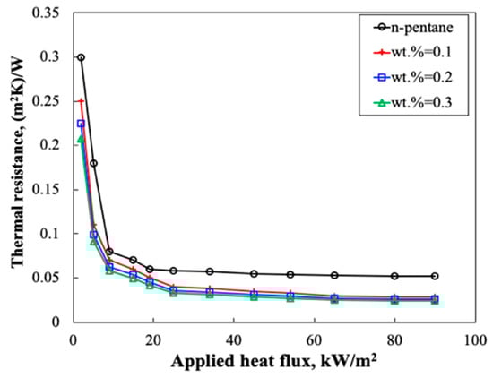 Variation of the thermal resistance with the applied heat flux for n-pentane and nanofluids.