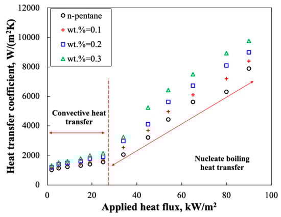 Figure 4 presents the alteration of the HTC of the evaporator with the applied heat flux to the evaporator. As can be seen, with increasing the applied heat flux to the evaporator region, the HTC of the heat pipe increases, which can be attributed to the intensification of the heat-transfer mechanism from convective heat transfer towards the nucleate boiling. Also, at higher heat fluxes, the rate of the evaporation increases as well. Notably, the slope of increase from a specific heat flux changes and is promoted. For example, for heat fluxes <25 kW/m2, the HTC increases slightly with heat flux; however, for heat fluxes >25 kW/m2 the HTC increases significantly, which can be attributed to the incipience of the nucleate boiling in the evaporator, which promotes the HTC of the system. As an example, at heat flux (HF) of 20 kW/m2, the HTC for pentane was 1755 W/(m2K), though, at HF = 45 kW/m2, the HTC was 2900 W/(m2K). Also, for the nanofluids, the HTC was larger than those of measured for pentane. For instance, for wt. % = 0.1, at HF = 90 kW/m2, the HTC was 7900 W/m2. K, whereas it was 8210 W/m2. K and 9820 W/m2. K for wt. % = 0.2 and 0.3, respectively.