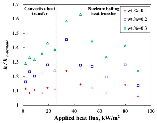 Figure 5 also shows the enhancement in the HTC of the evaporator. As can be seen, the enhancement in the HTC for region in which HF is <25 kW/m2 is relatively small in comparison with those of recorded for the HF >25 kW/m2. For example, for wt.% = 0.1, the HTC enhancement at HF of 15 kW/m2, and 25 kW/m2 was 1.08 and 1.12, respectively. However, at HF of 35 kW/m2 and 80 kW/m2, it was 1.24 and 1.13. As discussed, this can be attributed to the incipience of the nucleate boiling heat transfer, which further promotes the HTC of the system. Also, owing to the presence of the GNPs, the Brownian motion and the thermophoresis effect of the GNPs, improves the HTC of the system. Hence, nanofluid showed better HTC in comparison with pure pentane.