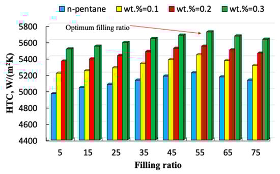 Figure 6 shows the variation of the HTC of the system with the HTC for heat flux of 65 kW/m2 for pure pentane and nanofluids. In this heat flux, nucleate boiling occurs as temperature of the evaporator was above 100 °C. As is clear, initially, with increasing the HTC of the HP, the HTC of the system increases reaching to a point that a trade-off occurs between the space available in the evaporator for the migration of vapor to the condenser and the amount of the liquid available in the evaporator. On the other hand, with a raise in the amount of the working fluid, the thermal capacity of the fluid augments. It should be noted that the space available in the HP becomes a limiting factor. Therefore, there is an optimum for the HTC, which is 0.55 for the present work. For example, at FR = 0.55 the HTC for water and nanofluids at 0.1%, 0.2% and 0.3% are maximized which are 5200 W/(m2K), 5450 W/(m2K), 5510 W/(m2K) and 5700 W/(m2K), respectively.