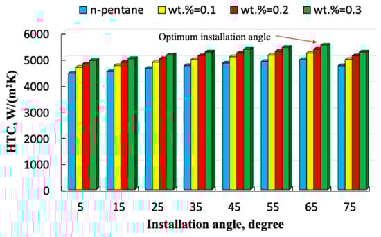 Variation of the HTC with the installation angle of the HP for pure n-pentane and nanofluids.
