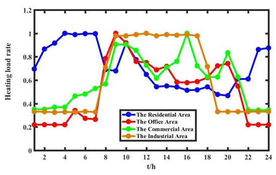 The typical heating load rate curves of multiple functional areas are shown in Figure 1. The x-axis represents 24 h of the day.