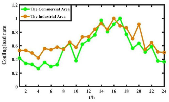 It can be seen from Figure 2 that the cooling loads only exist in the commercial area and the industrial area, and the variation characteristics of cooling loads in these two functional areas are relatively similar. Due to the higher outdoor temperature, the cooling load rate is higher in the daytime and lower at night. The cooling load rate reaches the full day peak around 2 p.m.–4 p.m. The temperature requirement of storage cooling loads is much stricter in the industrial area than in the commercial area, which is the reason why the storage cooling load curve seems smoother in the former area.