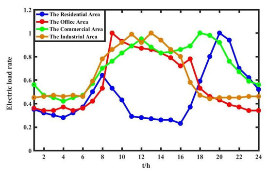 Referring to the analysis method of daily loads curves in [26], typical electrical load rate curves of the four functional areas are shown in Figure 3. The x-axis represents 24 h of the day.