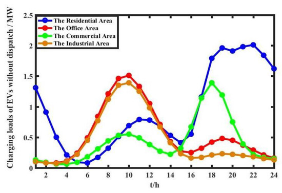 It can be seen from Figure 4 that since residents in the residential area usually go out early and go home late, EVs are charged concentratively at night and the peak period of charging loads occur around 10 p.m. EVs in the office area are charged during working hours, usually from 8 a.m. to 5 p.m. The concentration period of load charging in the commercial area is generally 5 p.m.–9 p.m., and fast charging is taken due to the shorter parking time. Charging loads characteristics of the industrial area are similar to that of the office area, and are concentrated in the working hours from 8 a.m. to 5 p.m. for charging. However, the charging loads from 6 p.m.–9 p.m. in the industrial area are lower than that in the office area, because a small part of the office staff overworks. The number of EVs in the office area is higher than that of EVs in the industrial area during this period.