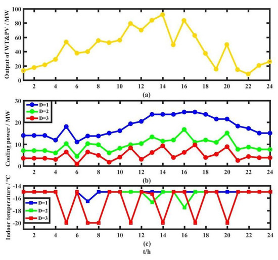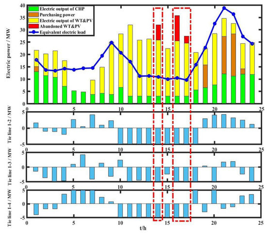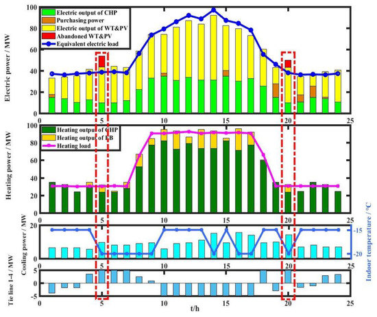 It can be seen from Table 3 that the heating loads, the cooling loads, the electric loads, and the charging loads of multiple functional areas have different characteristics. The functional areas could be connected through tie lines and the transferability of EVs to achieve complementary coordination and reduce the abandonment rate of renewable energy. The heating/cooling loads inside a functional area also have a certain flexibility and adjustability, which could be utilized to improve the consumption of renewable energy and suppress the volatility of renewable energy.