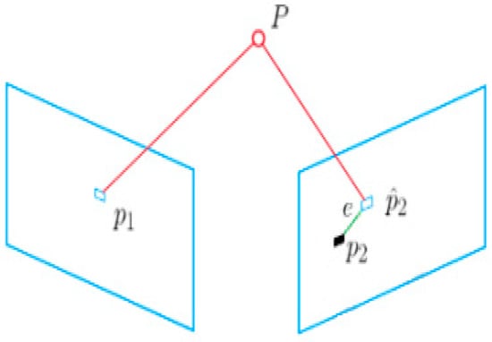 As shown in Figure 3, for the feature point pairs and in adjacent frames, a real-world spatial point corresponding to could be localized at first, and then is re-projected onto the latter frame to form the feature point position of the image. Due to the error of position and pose estimation, the existence of and is not a coincidence. The distance between these two points could be denoted as a re-projection error. Pure vision SLAM usually extracts and matches feature points, approaches like EPnP [29] can be applied to estimate the pose transformation of adjacent frames. Where R represents the rotation matrix, and t represents the transformation matrix.