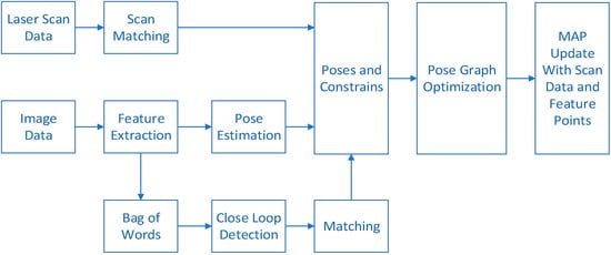 Base on the framework and key parts introduced in Section 2, this paper proposes a new SLAM framework of low-cost LiDAR and vision fusion. In the framework, for the back-end graph optimization, a new united error function of combining visual data matching error and laser data matching error is introduced. Meanwhile, in order to solve the problem of loop detection of traditional LiDAR-SLAM, a loop detection method is added, by introducing and visual data and bag-of-words. The integrated SLAM framework combining with laser and vision data is shown in Figure 4 below: