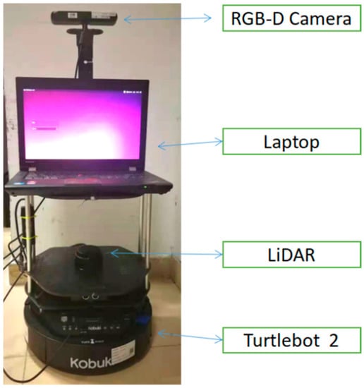 The experiment was carried out on a robot platform based on Turtlebot 2, equipped with a notebook, a LiDAR and an RGB-D camera. The notebook has Intel Core i5 processor and 8G memory, running on Ubuntu 14.04 + ROS Indigo system. The robot platform is shown in Figure 6: