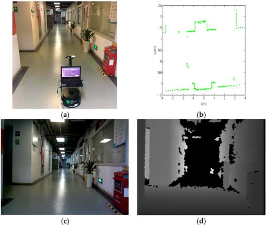 With the robot platform, we have collected several typical indoor databases in the “rosbag” format, which is easy to read for ROS. For each database, it contains sensor data obtained by the robot while it is running in a real scene, including odom data, laser scan, color image and depth image. Figure 7 shows one example of the database. Where Figure 7a displays the robot in the environment; Figure 7b shows the scan data obtained in the place; Figure 7c is the RGB image; Figure 7d is the depth image.