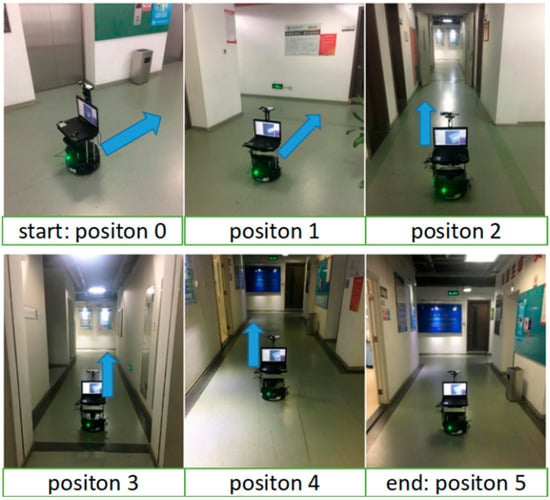 Firstly, in order to evaluate the positioning accuracy while mapping, we manually marked 6 positions in a real scene, as shown in Figure 8. The start point position 0 is specified as the original point (0,0) in the world coordinate system. As shown in Figure 8, the robot started from position 0 and stopped at position 5, and the blue arrow in each picture is the robot’s moving direction. Table 2 shows the result of positioning in the SLAM system from position 1 to position 5.