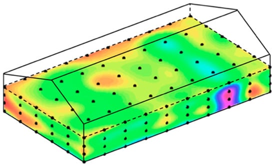 For the global temperature profile, the parameters in the mean function are determined by the properties of grain that are listed in Table 1. Given the grain temperature sensing data in the real case, we chose = 0.5 m, = 0.5 m, = 0.5 m, and = 1 day to satisfy the stability condition of the finite-difference method in Equation (4). We acquired the sensing data of the granary walls collected by the sensors on the walls and adopted a Gaussian process model [26] for interpolation using the sensing data on the granary walls to obtain the boundary conditions of the thermodynamic model.