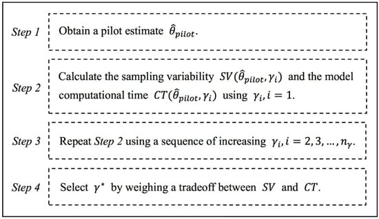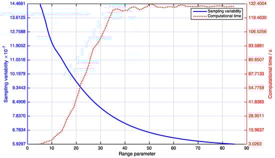 The procedure of selecting is as follows (Figure 4): First, we obtain a pilot estimate . For example, we calculate the MLE for a small and randomly chosen subset of sensing observations. Second, we calculate the sampling variability and model computational time for an available value of . The initial value is the minimal range parameter value. Third, we repeat the second step and calculate the sampling variability and model computational time for with , where is the number of ; Finally, we select to construct a balance between the sampling variability and the model computational time , that is, smaller sampling variability and shorter model computational time.