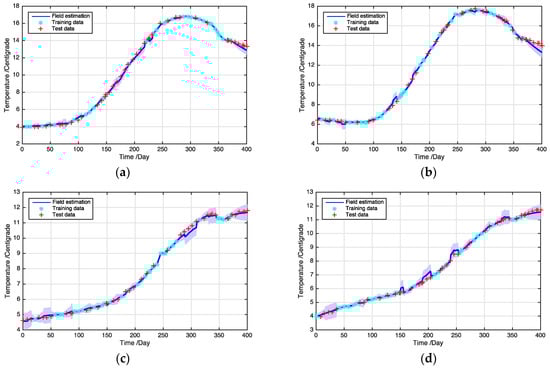 where denotes a sensing observation in the test data set, and denotes the estimated temperature value of . We tested the proposed field estimation method by estimating the grain temperature at the sensor sites of test data set by Equations (15) and (16). The MSE is equal to 0.04, which indicates the effectiveness of the estimation results using the proposed field estimation method. We show the examples of temperature profiles by the proposed field estimation method in Figure 7. The blue-star dots represent the training data, the red-plus dots represent the test data, and the blue lines denotes the estimated temperature profiles using our proposed method. The results show both interpolation and prediction capability of the proposed model with acceptable confidence intervals.