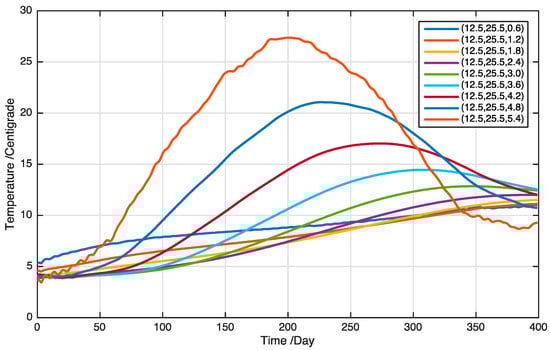 Figure 8 shows an example of temperature profiles at different locations estimated by the proposed field estimation method. The grain temperature field obtained by our model changes with seasonal effects. Specifically, grain temperature inside the granary varies more slowly over time and has a smaller fluctuating range than grain temperature at the outer locations. This finding is consistent with the grain temperature fields in most of the granaries in China. Moreover, it provides a new quantitative understanding of temperature field evaluation in granaries [34].