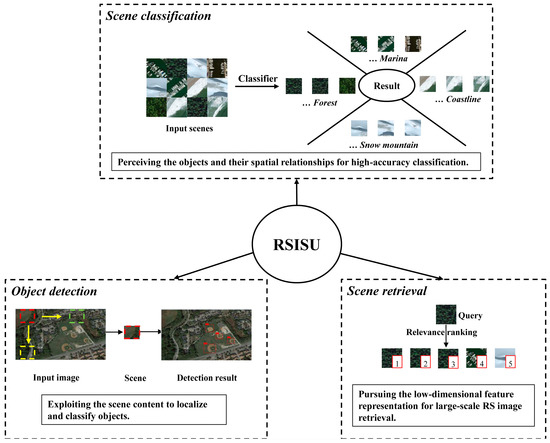 As the basic tasks of RSISU, remote sensing image scene classification, remote sensing image scene retrieval, and scene-driven geospatial object detection share some communal hints (e.g., scene abstraction) but have key respective techniques, as well as different goals. More specifically, remote sensing image scene classification pursues a high-accuracy classification result by perceiving the objects and their spatial layout, whereas remote sensing image scene retrieval often maps the remote sensing image scene to an efficient representation (e.g., the low-dimensional feature vector) to address the large-scale image retrieval problem. Scene-driven geospatial object detection aims at recognizing the objects by exploiting the scene context. Around each sub-task, large amounts of methods have been proposed and summarized in a specific review. For example, Cheng et al. [2] summarized the remote sensing image scene classification methods, Xia et al. [3] reviewed the remote sensing image scene retrieval methods, and Cheng et al. [4] conducted a survey on the different kinds of remote sensing image object detection methods. Currently, there are no systematic surveys available in regard to the bigger research topic—namely, RSISU.