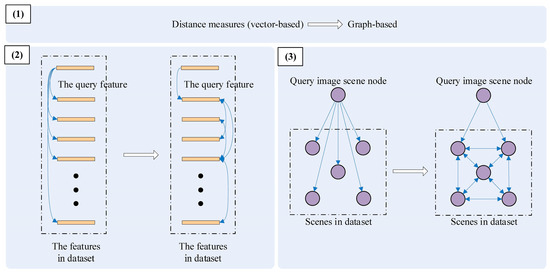 Schematic diagrams of distance measures and graph-based measures. The picture on the left is the principle of feature-level retrieval, and the picture on the right is the principle of scene-level retrieval. A one-way arrow indicates similarity matching between the query scene or corresponding feature and the dataset scene or corresponding feature. Two-way arrows indicate there exists transmission of information between scenes or scenes features, so the scenes in the dataset aren’t feature-level isolated.