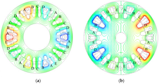 According to Table 1, the simulation models five-phase 30/24-pole and 20/16-pole WFDSG are established by using the magnetic field finite element software. The simulated no-load magnetic field distribution is shown in Figure 1.