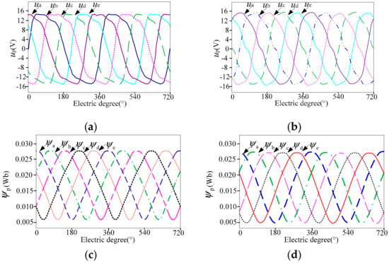 Figure 2c,d show the flux linkages of the two WFDSG with a field current of 3A. It can be seen from the waveform that the magnitudes of the flux linkages of the 30/24-pole and 20/16-pole five-phase doubly salient electromagnetic machine (DSEM) are equal, and they are symmetrical phases.