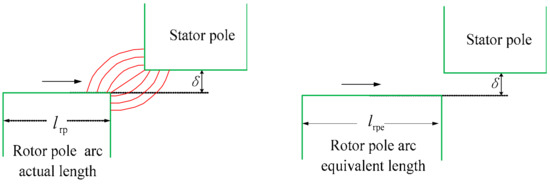 However, due to the core fringing effect, the magnetic flux is conducting before the stator and rotor poles start to slip together, as shown in Figure 3. Since the principle is similar to the actual length of the iron core in the machine design, it can be used to refer to the definition of the equivalent length of the core in the machine design. Here, let the rotor pole arc equivalent length be the performance functional pole arc length, and it is larger than the rotor pole arc actual length , as shown in Figure 3.