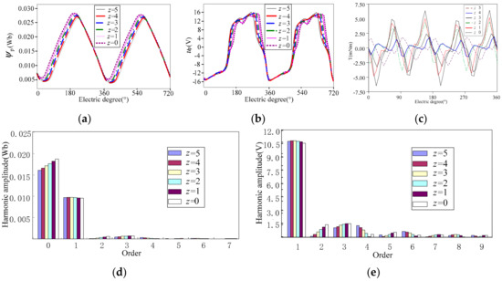It can be seen that the arc length of the rotor has a direct influence on the peak and valley length of the flux linkage, as well as affects the induced EMF waveforms. When the arc length of the rotor changes within the above range, the amplitudes of no-load induced EMF are almost equal. As z gradually decreases from 4 to 0, the rotor pole actual length gradually approaches the ideal pole arc length in Equation (13), the fundamental wave content of the no-load EMF and the flux linkage gradually decrease. On the other hand, if is increased to 5, the rotor pole length is smaller than the ideal pole arc length in Equation (13), and fundamental wave content of the no-load EMF and the flux linkage are also smaller than that of = 4. In summary, when = 4, the fundamental wave content of each phase flux and no-load EMF is the largest.
