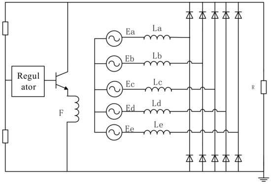 Figure 5a,b shows the excitation coil and armature coil on the stators of the two five-phase WFDSGs, respectively, which realize brushless excitation. And without winding and permanent magnet, the rotor structure is simple and suitable to operate in high temperature and high-speed situations. In addition, the windings of each phase on the stator are physically and electromagnetically independent, which enables the WFDSG with isolation and fault tolerance characteristics. In Figure 6, a five-phase rectifier and a regulator are used to output steady DC voltage by adjusting the excitation current.