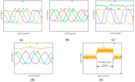 The normal and one phase open-circuit experiment waveforms. (a) Normal no-load EMF of the 30/24-pole WFDSG; (b) normal no-load EMF of the 20/16-pole WFDSG; (c) no-load EMF with one phase open-circuit of the 30/24-pole WFDSG; (d) no-load EMF with one phase open-circuit of the 20/16-pole WFDSG; and (e) excitation current with one phase open-circuit.