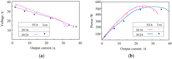 Comparing the external and output characteristics of the two WFDSGs, it can be seen that the output voltage and output power of the 20/16-pole WFDSG are larger than the 30/24-pole when the output current is less than 27A, which is also consistent with the simulation results, and this verifies the increase in the number of poles will deduce the second air gap and increase the leakage coefficient of the WFDSG. When the output current is larger than 27A, the output voltage and output power of the 20/16-pole WFDSG drop sharply due to the large demagnetization effect of the armature reaction because there are more turns of the armature winding around each pole of the 20/16-pole WFDSG. Although the armature reaction sometimes enlarges the excitation flux and sometimes reduces it, in the case of almost saturation excitation, the enlargement is difficult to increase the magnetic density of the core, but the demagnetization of the armature reaction can reduce the magnetic density of the core [36].